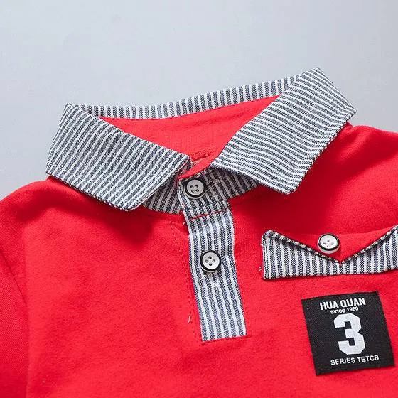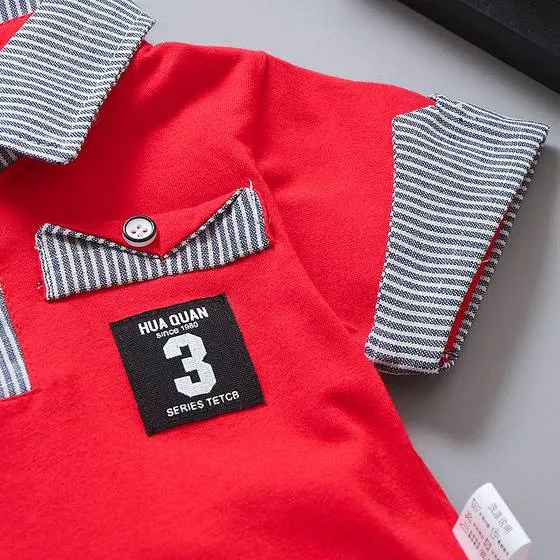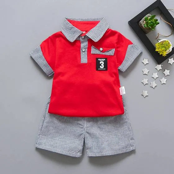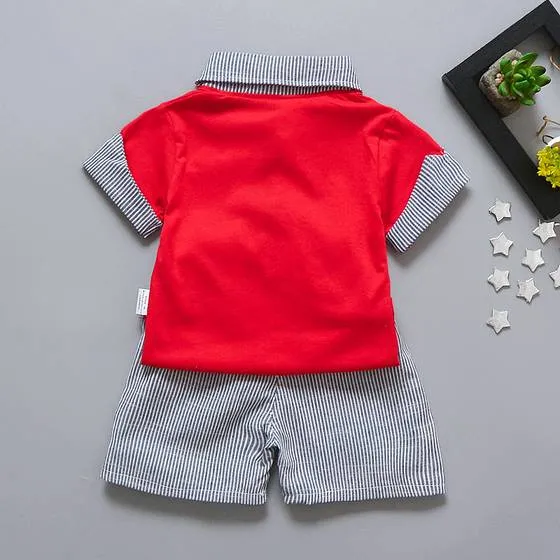 Conjunto de 2 piezas, playera tipo polo roja con detalles en rayado, short rayado con bolsillo de suave elastico en la cintura para comodidad del bebé.